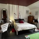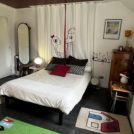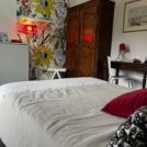 Une chambre avec un grand lit 160 cm, une salle de bain attenante avec baignoire – douche.